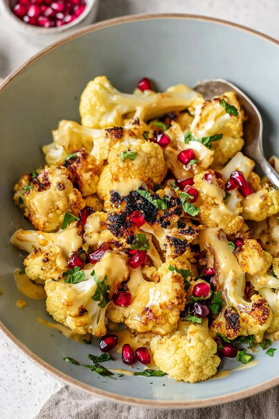 - 5 Once cauliflower looks roasted and smells nutty with smoky paprika aroma, transfer to serving dish. Drizzle sauce generously or serve on side for dipping—both are decent. Toss chopped dates and pomegranate over top for chewy sweetness and juicy bursts. Parsley sprinkles add waving fresh green and herbaceous scent.