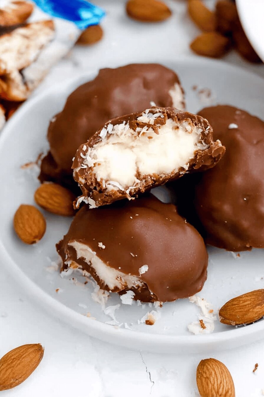 - 💡 Shape filling fast. Use powdered sugar on hands or bars stick like glue. Scoop by 1½ inch cookie scoop, shape into oval 1½ by 2¼ inches. Oval increases surface area for chocolate and almonds. Two whole almonds pressed on top before freezing helps nuts stick during handling. Press extra if loose. Almonds snap better after freeze than after dip or they fall off instantly.