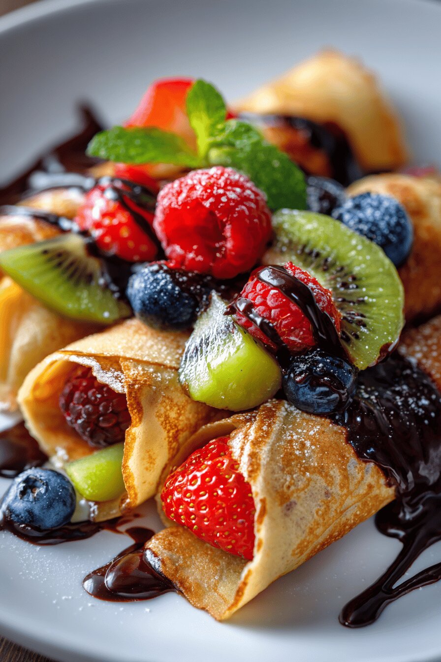 - 4. Roll each crêpe gently. Arrange on plates. Spoon over warm dark chocolate sauce generously. Scatter mixed berries and kiwi slices on top. Eat immediately. Sauce seeps into crepe folds; berries add tart freshness and vibrant texture.