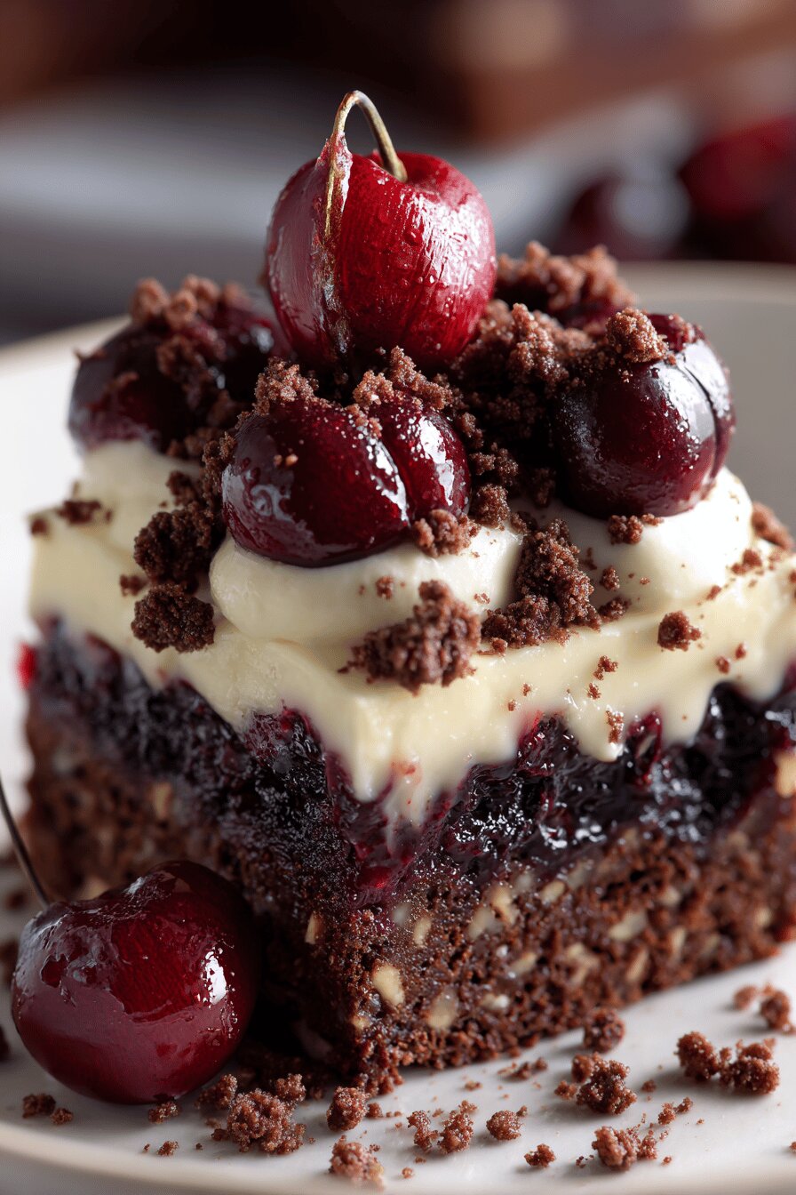 Hazelnut and cherry, with amaretto bringing warmth. White chocolate cream whipped, thickens with chill. Brownie base sturdy, slightly fudgy, scattered with toasted nuts. Cherries cooked down thick, jelly-like, rest on rich brownie. Smooth dark chocolate custard cloaks fruit, cooling into silky coat. Crunch of cocoa-dusted chocolate crumble adds texture optionally. Layers of flavor — some fruity tart, some nutty sweet, all bold with amaretto whisper. Time and cooling key; patience richer than rush. Fudgy brownie beneath, creamy layers above, whipped top crowning. Slices hold shape, speak nutty, fruit, and spirit. Different notes in each bite; play on textures. Forgone some sugar, adjusted chocolate ratio; balance gained by tweaks. From baking heat to chilled set, dessert shifts states, ending rich yet airy, firm yet yielding. Brownies with edge chopped off, neat squares shine under cream and crumble. Cherries fresh or frozen, work either way