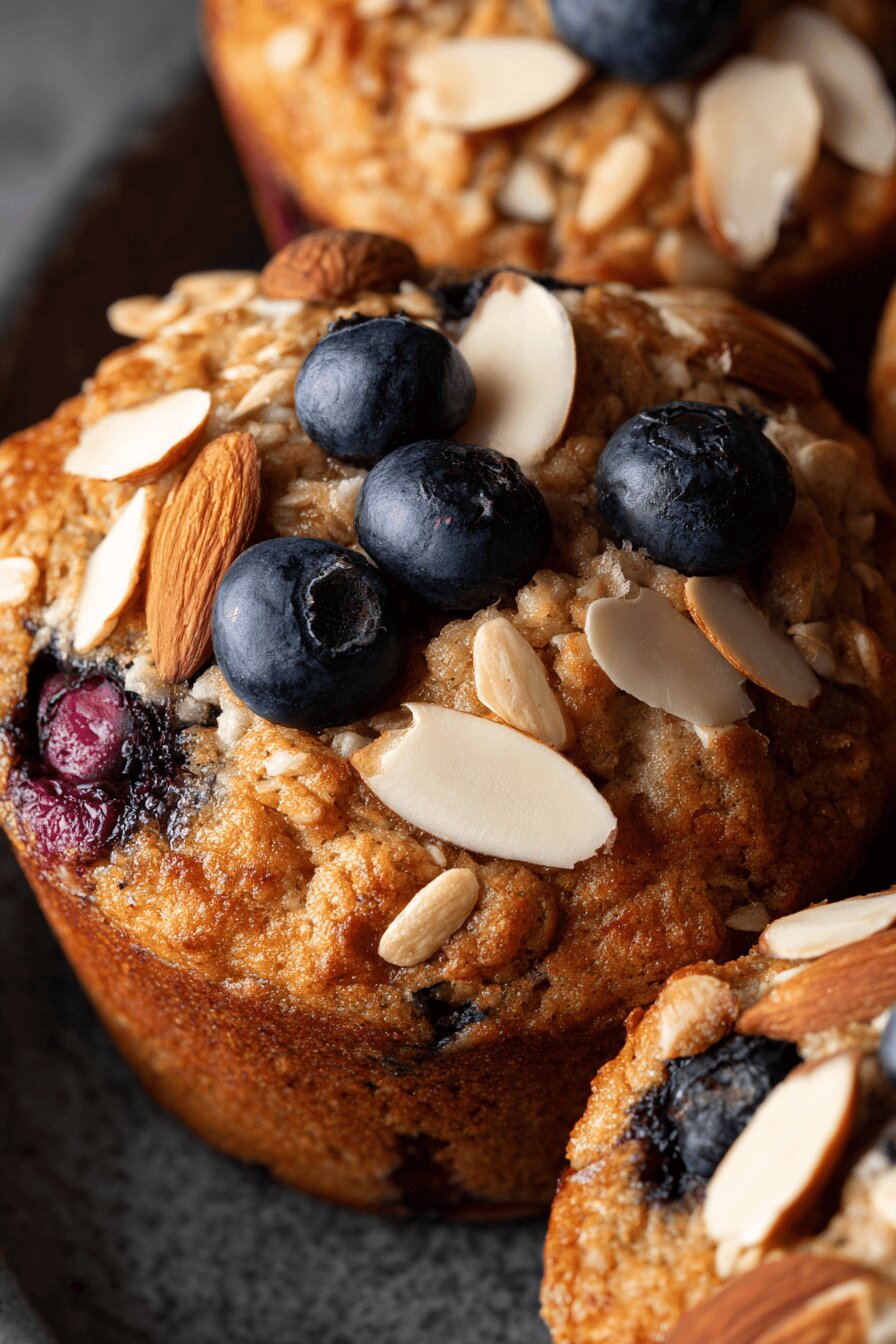 Muffins made with almond meal, rolled oats, whole wheat flour, and brown sugar. Eggs mashed with Greek yogurt and grated apple add moisture. Fresh or frozen blueberries folded in last. Topped with sliced almonds for crunch. Baked until toothpick clean. Stored in airtight container, keep cool. Best eaten fresh.