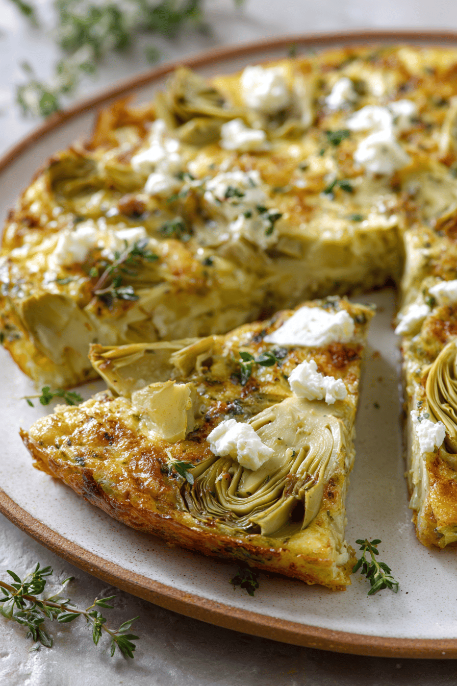 Artichokes cooked down with garlic, white wine, and chicken broth. Eggs beaten with parmesan and oregano. Sautéed then oven-baked until set. No nuts, gluten-free, lactose-free. Four servings. A twist with thyme and goat cheese instead of parmesan. Longer simmer time to deepen flavor. Butter and olive oil for rich mouthfeel. Bright lemon keeps artichokes fresh. A simple main dish, versatile for any meal.