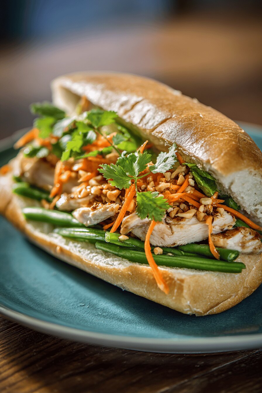 - 5. Split rolls, slather mayo inside. Layer chicken slices, carrot salad—crunch is essential. Add blanched green beans for pops of vibrancy, handful peanuts, then cilantro leaves. Press sandwich gently but not mashed.