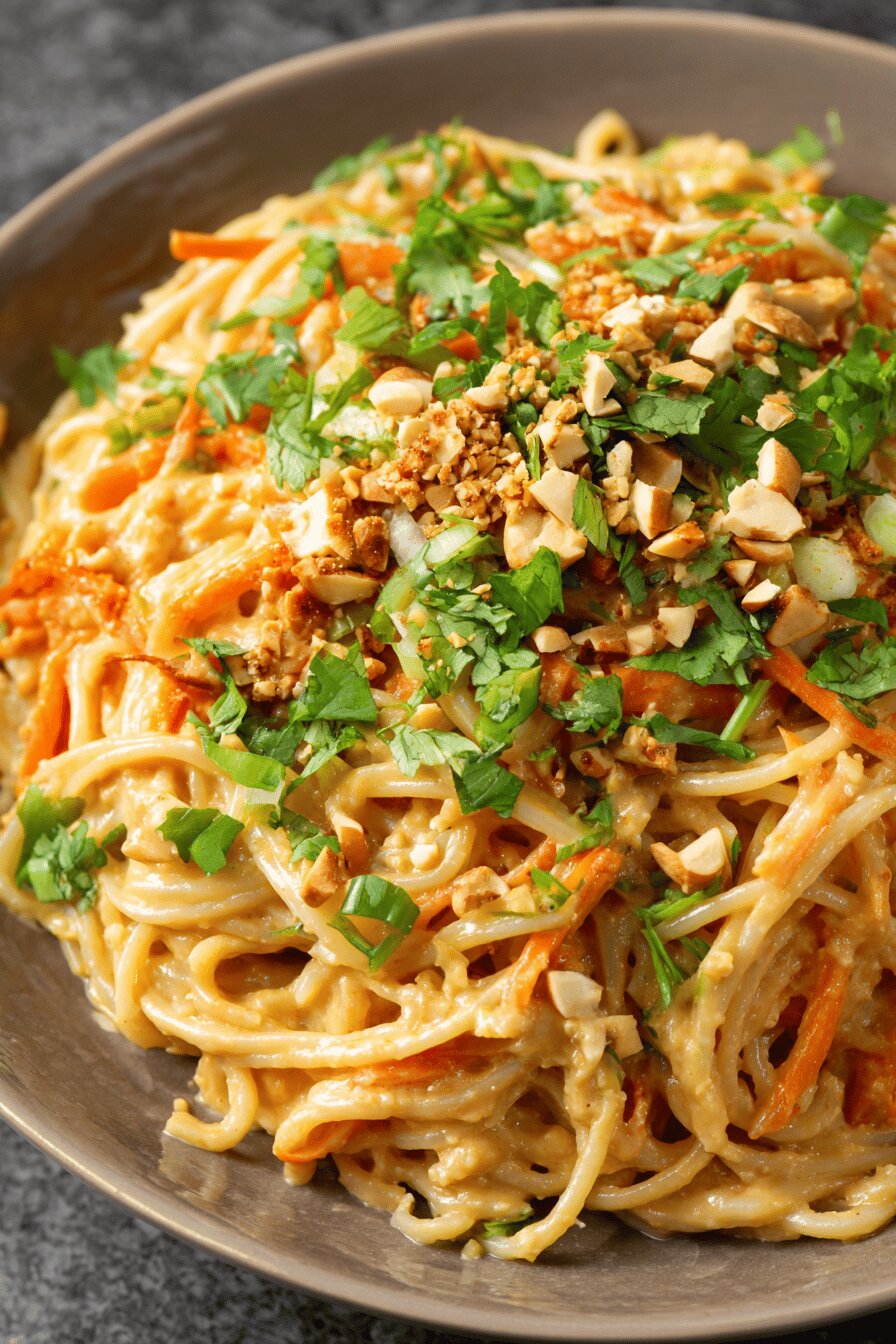- 5. Serve noodles in bowls. Sprinkle with cilantro and chopped almonds. Eat warm, mix toppings in.