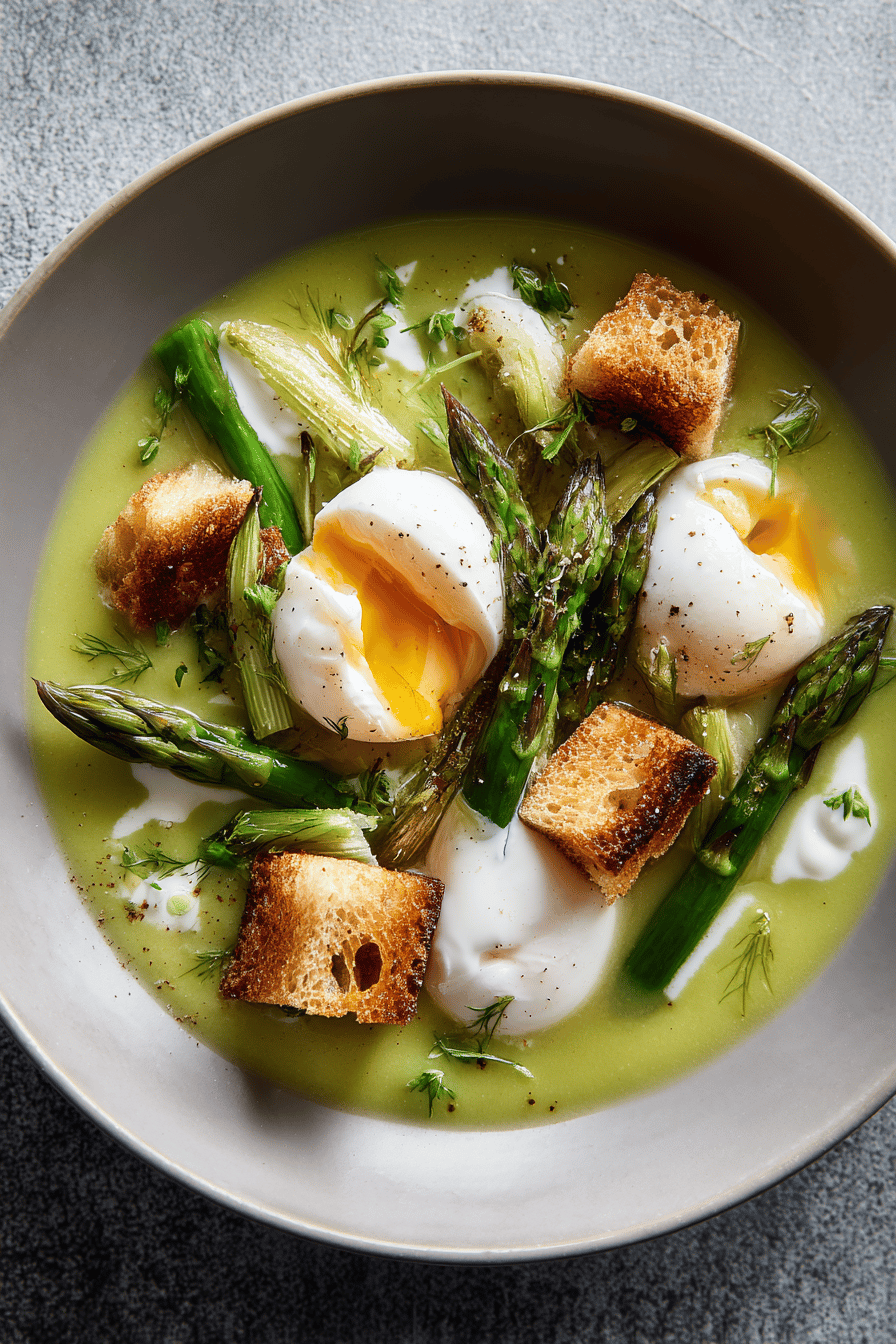 - Ladle soup evenly into warmed bowls. Place a toasted sourdough crouton in center of each dish. Top with poached egg. Arrange blanched asparagus tips around for texture contrast.
