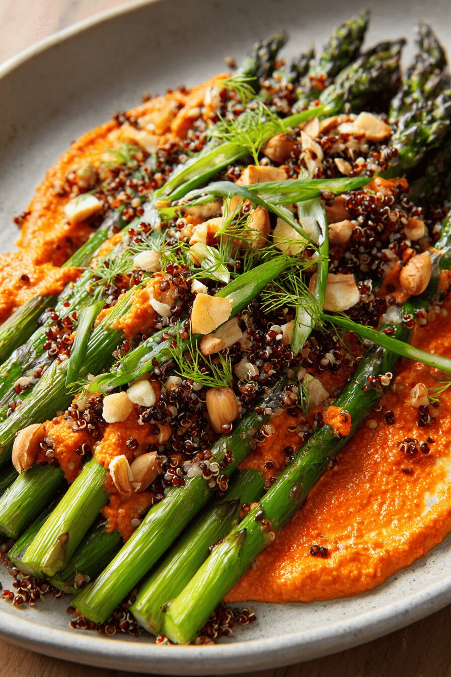Aim for blistered, blackened skin spots, not charred masses. Once roasted, enclose peppers in airtight container or foil to loosen skin — crucial step, makes peeling effortless. Peel carefully to avoid pith bitterness. Pulse blender ingredients gently to maintain rustic texture — over processing kills character. Toast quinoa before blending; crisp contrast essential. For asparagus, evenly spread out on sheet pan; overcrowding causes steaming, not roasting. Turn halfway through roasting to ensure even browning and softness. Salt timing affects texture; pre-salting draws moisture, which softens stalks prematurely. Serve sauce room temperature or chilled; warms flavor but preserves freshness. Sauce thickens in fridge — thin with olive oil or water when reusing. No microwave reheats; ruins aromatic oils. Learned patience from overcooked batches — lets ingredients sing naturally. Timing flexible, trust appearance and texture.