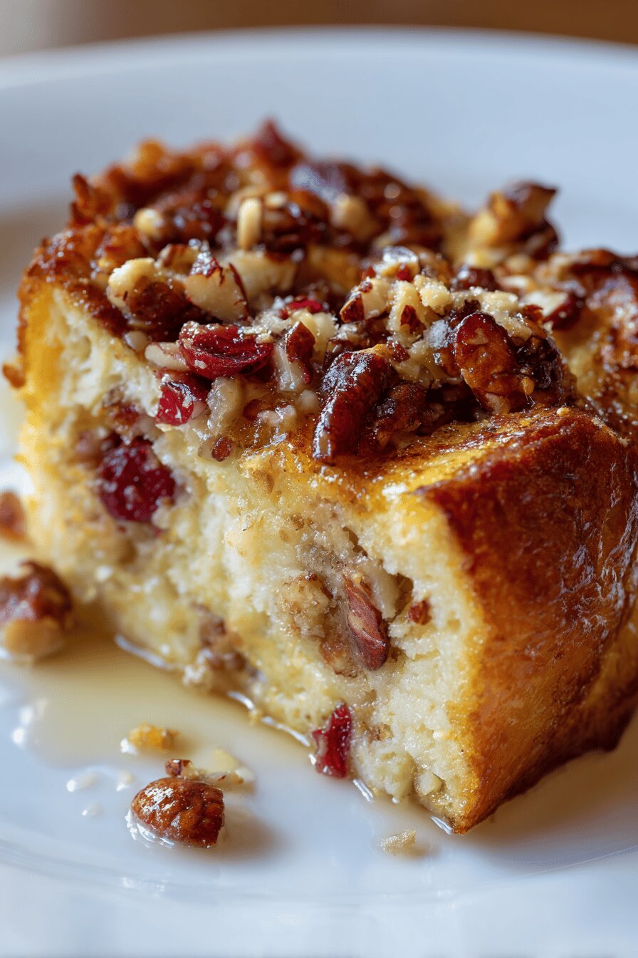 A rich baked French toast featuring a cranberry-pecan country loaf soaked in a custardy egg-cream-milk mix. Topped with a spiced frangipane made of softened butter, almond meal, brown sugar, and eggs. Baked until golden and set. Variations include swapping raisins for dried cherries and almond meal for hazelnut flour. Adjust soak and bake times slightly for texture. Serve warm after a short rest.