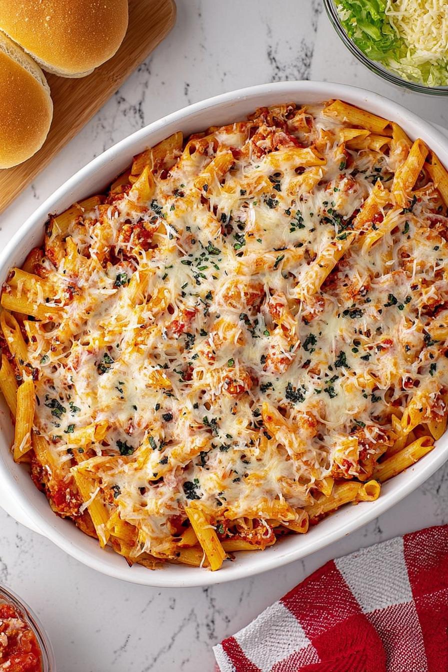 - 💡 Mozzarella is split two ways: half stirred into pasta mixture for stretch and melt cohesion, half scattered thick on top for golden bubbly crust. Pre-shredded mozz sometimes has anti-caking agents that ruin melt quality; freshly shredded works best for stretch and browning. Watch cheese closely toward end of bake; bubbling crackles and golden spots signal good timing.