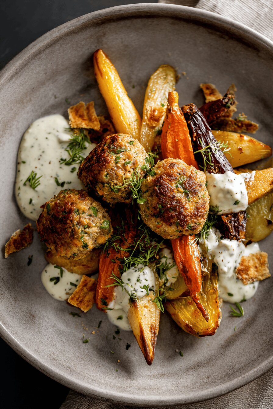 - 💡 Use visual cues over timers. Meatballs: golden crust and slight spring when pressed but cooked through inside. Vegetables: fork tender with caramel edges. Sauce: bubbling, thick but fluid. Overcooked veggies? Add quick sauté of fresh greens for texture and color contrast. Swap stock broth with mushroom broth for vegetarian depth in sauce; minced cooked mushrooms work for umami in meatballs. If short on time roast all in one pan but space veggies to one side to avoid steam traps.