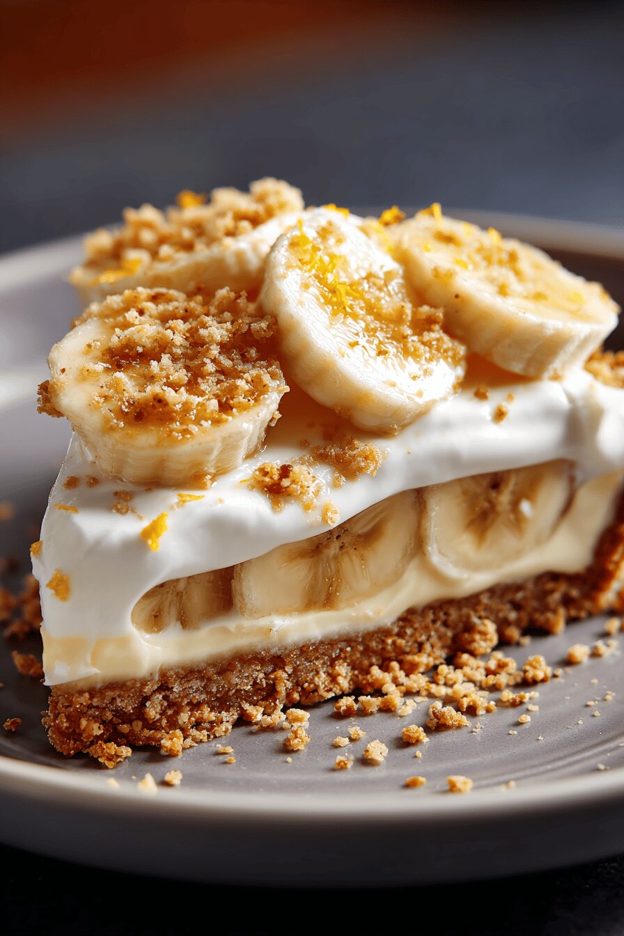 Banana creamy tart. Smooth custard but firm enough to slice. Tweak crust: oats instead of biscuit crumbs, hold better texture. Maple syrup sweetens crust over brown sugar. Custard uses cornstarch plus tapioca starch for a slightly different feel. Eggs enrich custard. Warm milk makes thickening faster. Every step matters: no lumps. Layer bananas thickly, ripe but still firm. Whipped cream with honey and orange zest—adds zing and undertone. Chill time adjusted a bit for texture. Keep fresh. Fridge life up to 3 days, best served cold. No nuts. Vegetarian safe. Minimal fuss but noticeable switch-ups. Next time, maybe cinnamon on top.