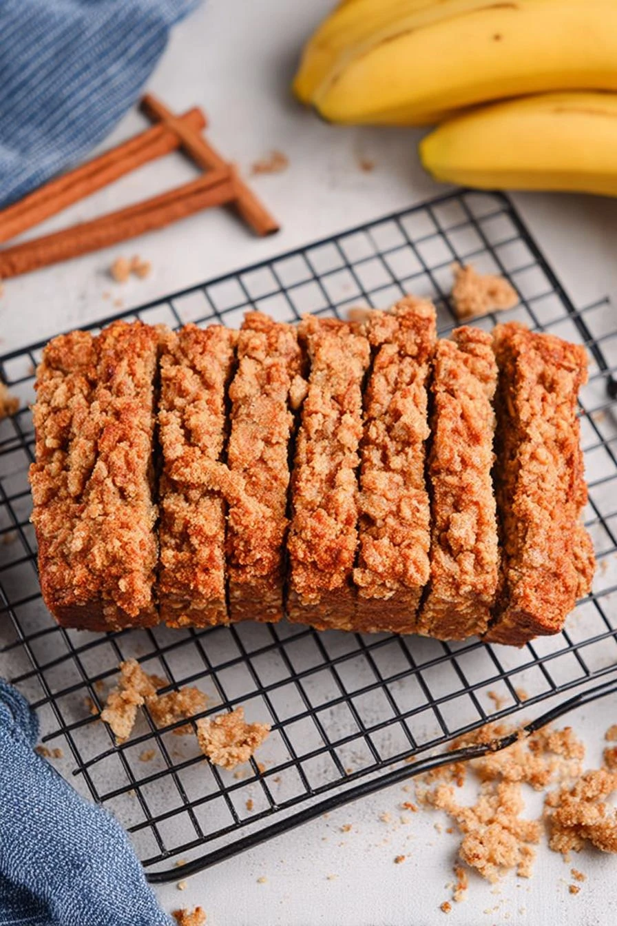 - 8 Bananas matter—spotty, mushy for max sweetness and moisture. Use room temp ingredients to avoid curdling or mixing inconsistency. No mixer? Hand beat butter and sugar vigorously or use whisk till pale. Streusel timing matters—add early, it sinks; add too late it won’t stick. Cut baking time by 5-7 mins if using a dark pan; dark pans absorb more heat and cause quicker browning. Listen for faint crackling aroma of cinnamon sugar—that smell means sugar is caramelizing nicely. If loaf spikes in middle, check oven temp or overmixing: too much air, rapid rise then collapse.