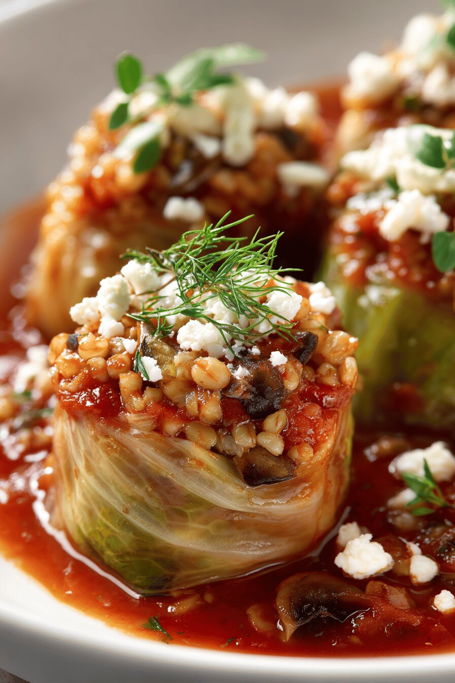 Cabbage leaves folded tight. Pearled barley bubbles under simmering broth, softening slow. Mushrooms bring earth, peppers pop red, zucchini fresh chunks in mix. Garlic bites sharper. Onion base sweetens. Wine sharp, reduces quick. Egg ties all. Tomato sauce blankets. Feta sprinkles tang. Layered textures, soft center, crisp edges when baked uncovered. Balsamic vinegar swapped in, thyme leaves fresh, aroma real. Cabbage leaves stripped of thick stems for easy folding. Cooking times slightly trimmed. Amounts cut for balance. Dinner waits.