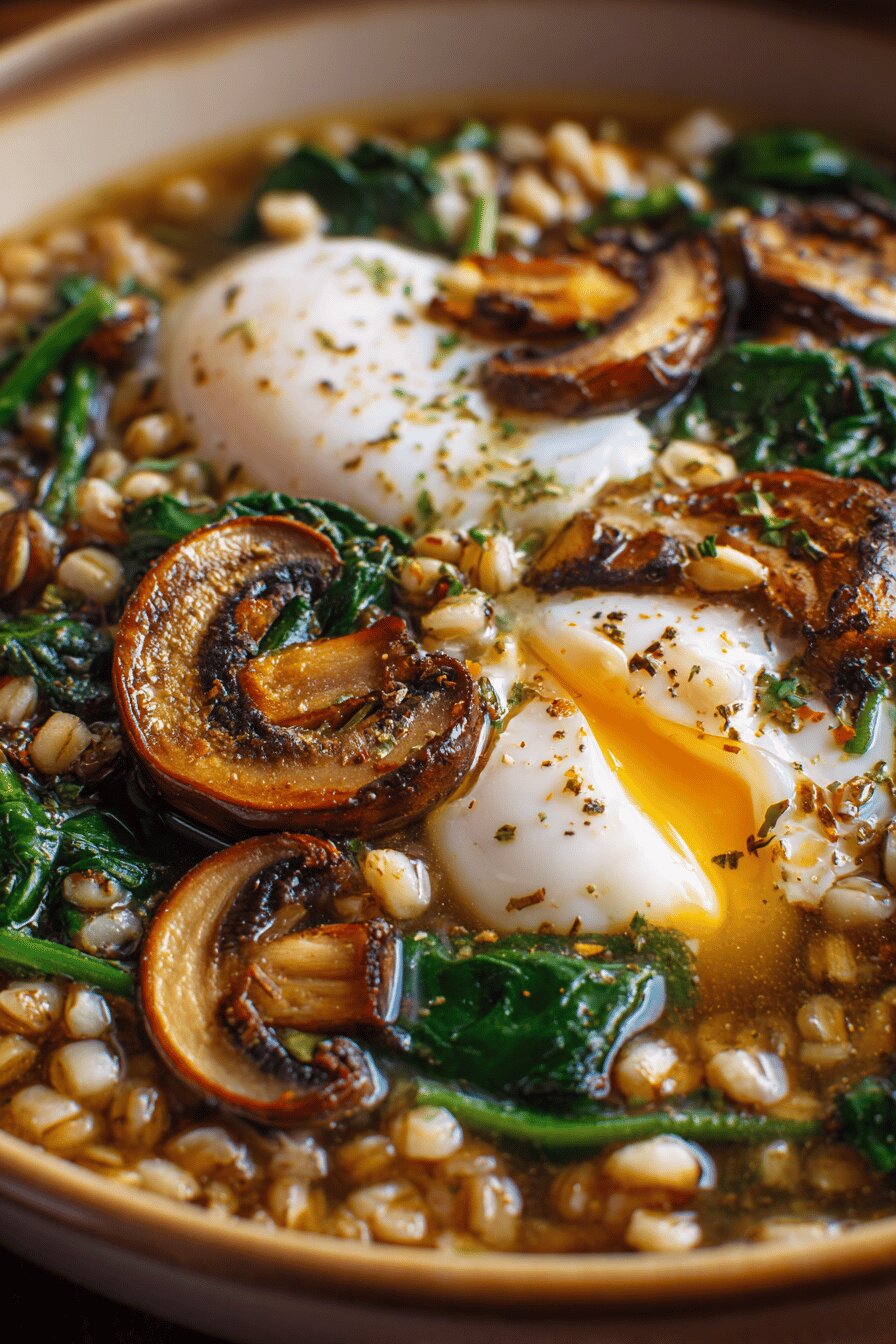 Cool quickly, refrigerate in airtight container up to 3 days. Reheat gently on stove, add splash water or broth to loosen. Poached eggs stored separately best, add fresh when serving. Soup freezes but barley texture softens with thawing, spinach may darken. Reheat fully warmed.