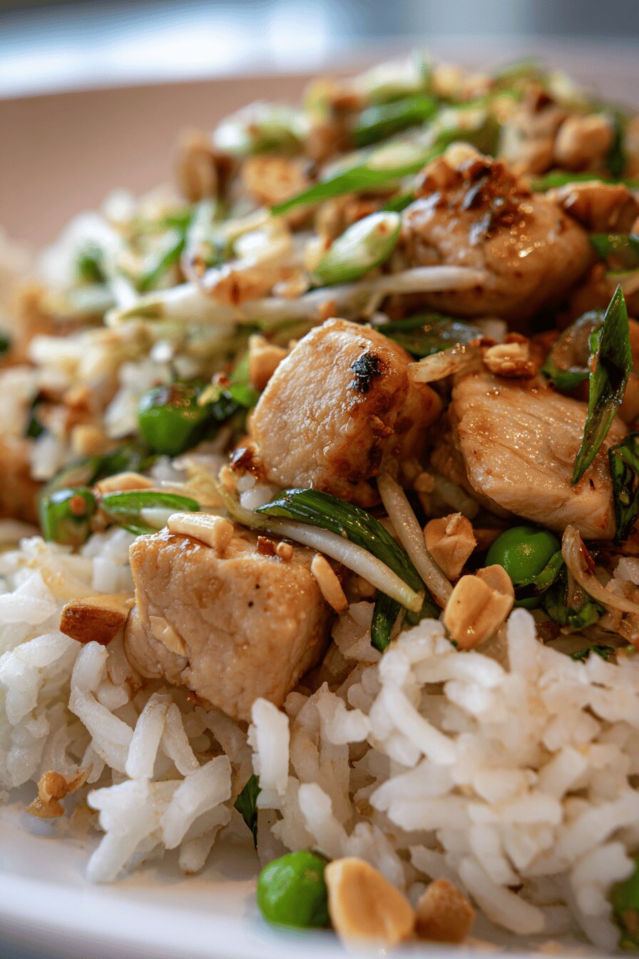 Basmati rice cooked with water, mixed with diced chicken breast, sautéed garlic and ginger, peanuts, water chestnuts, green peas, scallions, and mung bean sprouts. Sauces include a blend of fish sauce, hoisin, soy, and rice vinegar. Stir-fried quickly in toasted sesame oil with a hint of chili paste. Quick simmer, soak, and rest phases. Balanced, savory, nutty, and lightly spicy profile. Four servings, about one hour total.