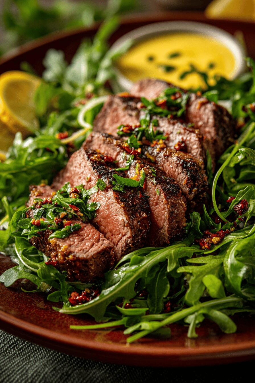 - Using a sharp knife, slice the beef thinly across the grain—this ensures tenderness and precise texture. Arrange slices on plates atop fresh arugula or baby kale.