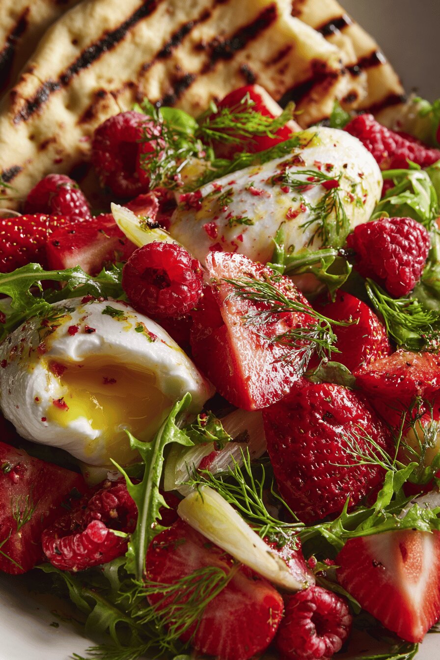 Fresh strawberries and raspberries mingled with crisp fennel slices and creamy burrata. Spiced with crushed fennel seeds and pink peppercorns, zested lemon, and a honey-citrus marinade. Lightly soaked fennel for crunch. Drizzle of olive oil and sprinkle of sea salt. Served alongside grilled naan bread for a textured contrast.