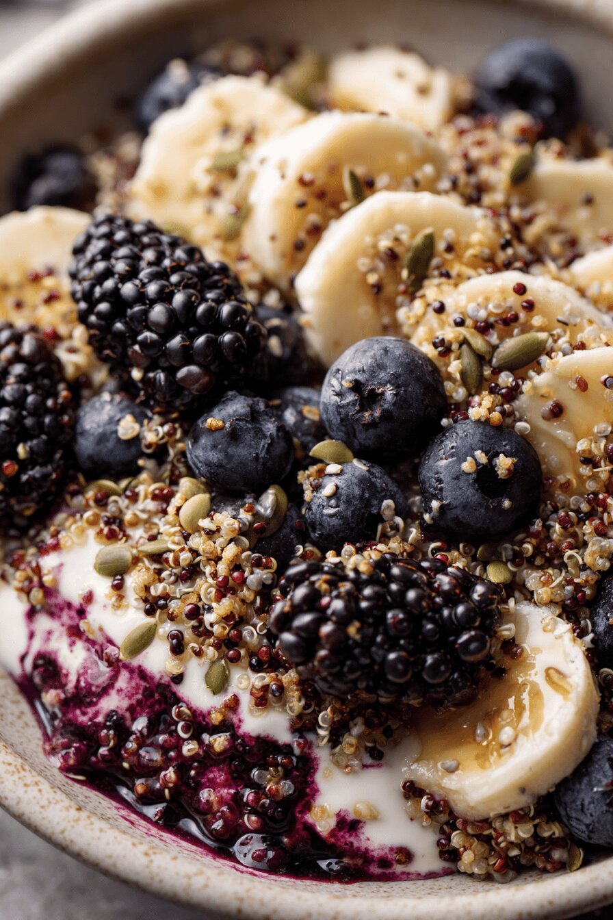 Yogurt, frozen blueberries, fresh blackberries, sliced half banana, real maple syrup, and quinoa granola rebalanced for a creamy, crunchy morning bowl. Uses a personal blender, blends mostly fruit and yogurt, topped last minute. Quick prep typical of near 20 minutes, some downtime for assembling and garnishing. Suitable for vegetarian, nut-free, gluten-free, egg-free diets with ingredient swaps for freshness and texture.