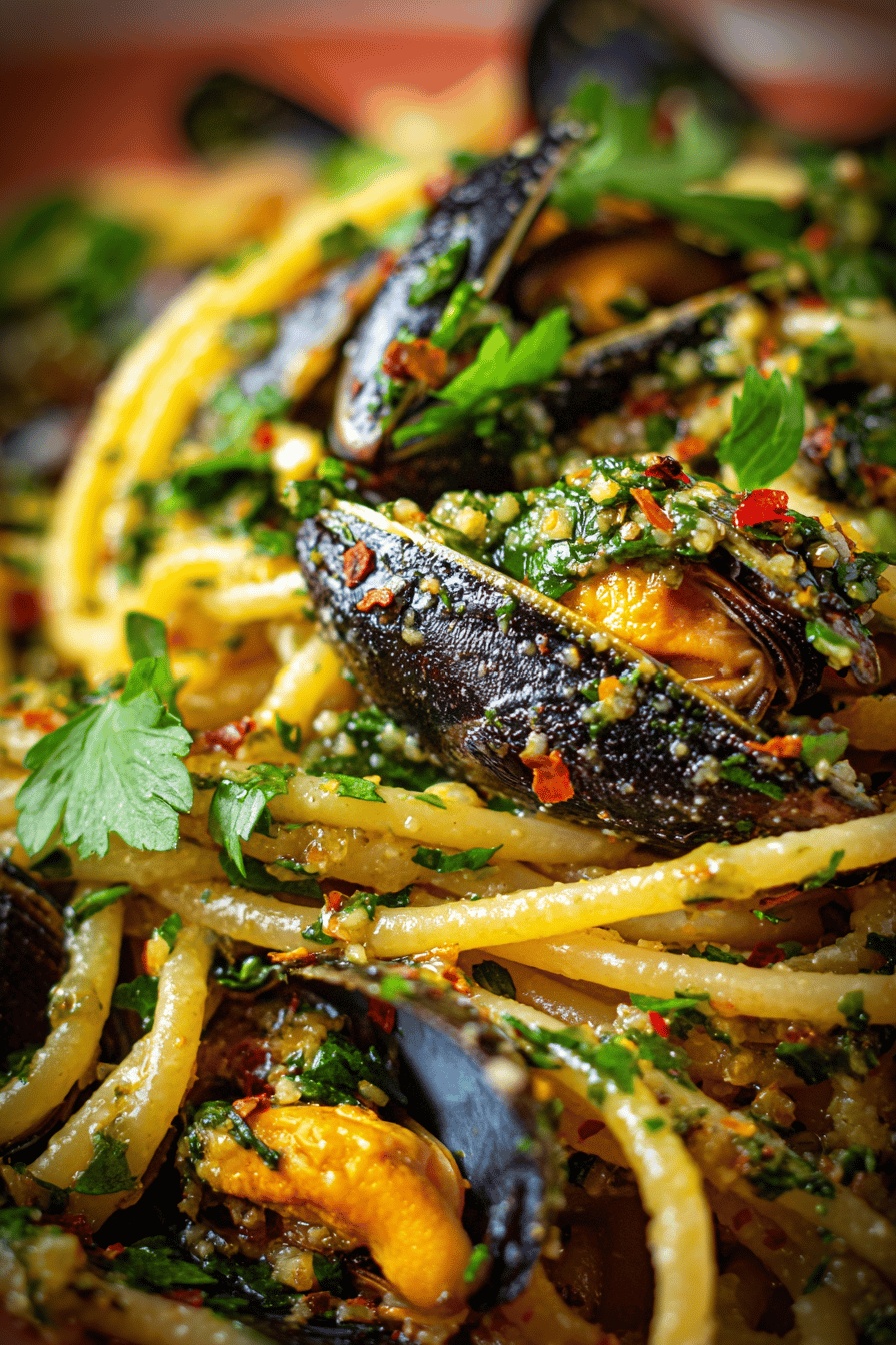Start by finely pulsing onion and olive oil in a food processor—avoids large chunks but leaves texture. Cooking onions low and slow crucial: cover pan to trap moisture, stir every 2-3 minutes to prevent browning too fast. Cook until translucent, some edges showing caramelization, total about 15-20 minutes. Add sherry and grapefruit juice next; sherry imparts nuttiness completing onion sweetness, juice sharpens. Simmer uncovered to reduce liquids by half, about 3 minutes. Stir often, watch anchovy substitute or fish sauce dissolve fully. Then throw in mussels, cover tightly, steam 5-6 minutes until shells open is key to avoid rubberiness. Remove half shelled, discard empty shells, return extracted mussels plus parsley to saucy pan. While mussels steam, boil salted water and cook pasta al dente—about 10 minutes. Keep some pasta water reserved to loosen sauce; add pasta and water to pan. Toss well so sauce coats bigoli, heat briefly 1-2 minutes to marry flavors. Serve immediately; flavors settle fast. Timing neat, doesn’t allow overcooking anything. Everything layered from base onion sweetness to sea-salty mussels to herbs and citric notes. A clash of textures and tastes built in proper sequence.