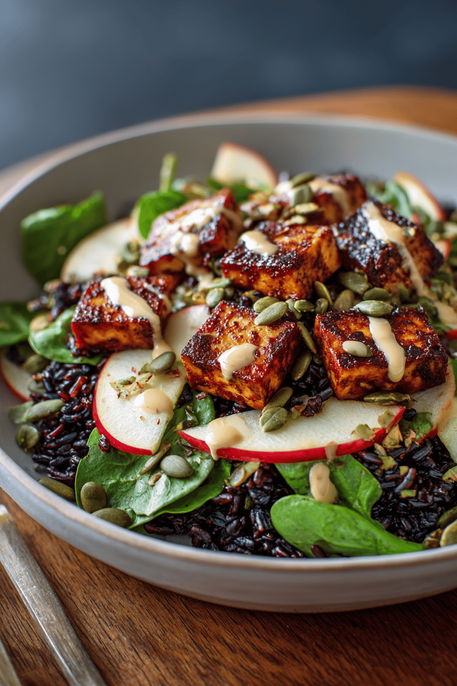 - Substitutions: Forbidden rice can swap to forbidden brown rice or wild rice but adjust cooking times. Agave or maple syrup works instead of honey, but honey caramelizes better on tofu. Apple cider vinegar can be white or balsamic if you want deeper notes. Tofu firmness matters; firm or extra firm holds shape better. If no pumpkin seeds, use toasted sunflower seeds or chopped walnuts, noticing nut allergies.
