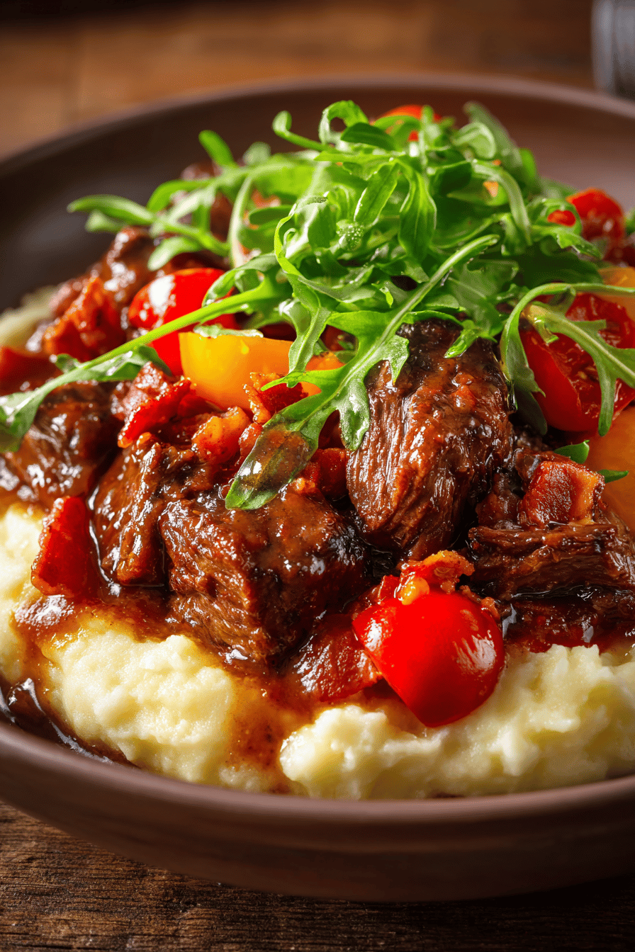 - Serve beef on creamy mashed potatoes or root veg mash. Spoon sauce over generously. Garnish with fresh arugula for bite and peppery contrast. The greens add lift to dense, braised flavors.