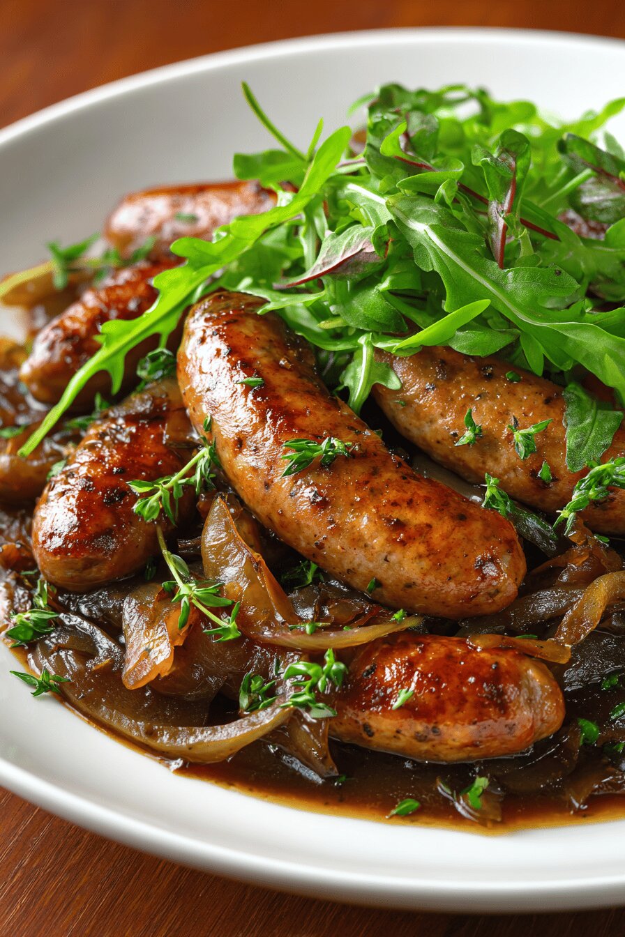 - 💡 Final uncovered simmer thickens sauce big time. Watch it reduce almost 75 percent, stick to meat. Sauce is lustrous, coats sausage and soft onions. If too thin, crank heat, stir or add broth splash if thickens too fast before ready.