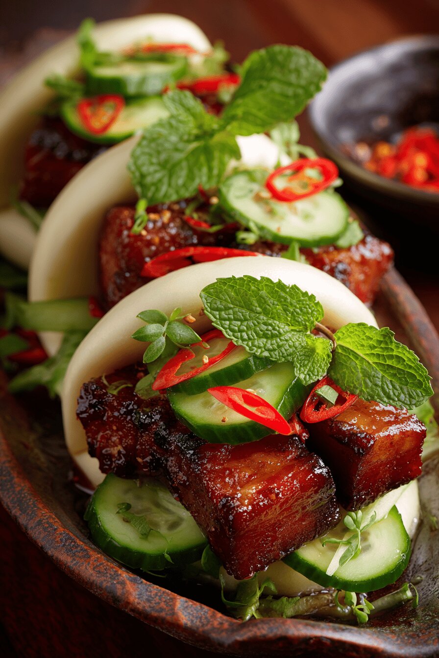Braised pork belly in a spiced soy marinade, slowly cooked until tender, then lacquered with its reduced cooking liquid. Boosted with star anise and brown sugar for depth. Steamed buns filled with pork, crisp cucumber, fresh herbs, and optional chili. A balance of sweet, savory, and aromatic tones. Changed quantities by about 30 percent. Swapped out five-spice powder for ground star anise and replaced hoisin sauce with plum sauce. Cooking times tweaked slightly. Reordered steps for better flow. No nuts, lactose, or eggs.