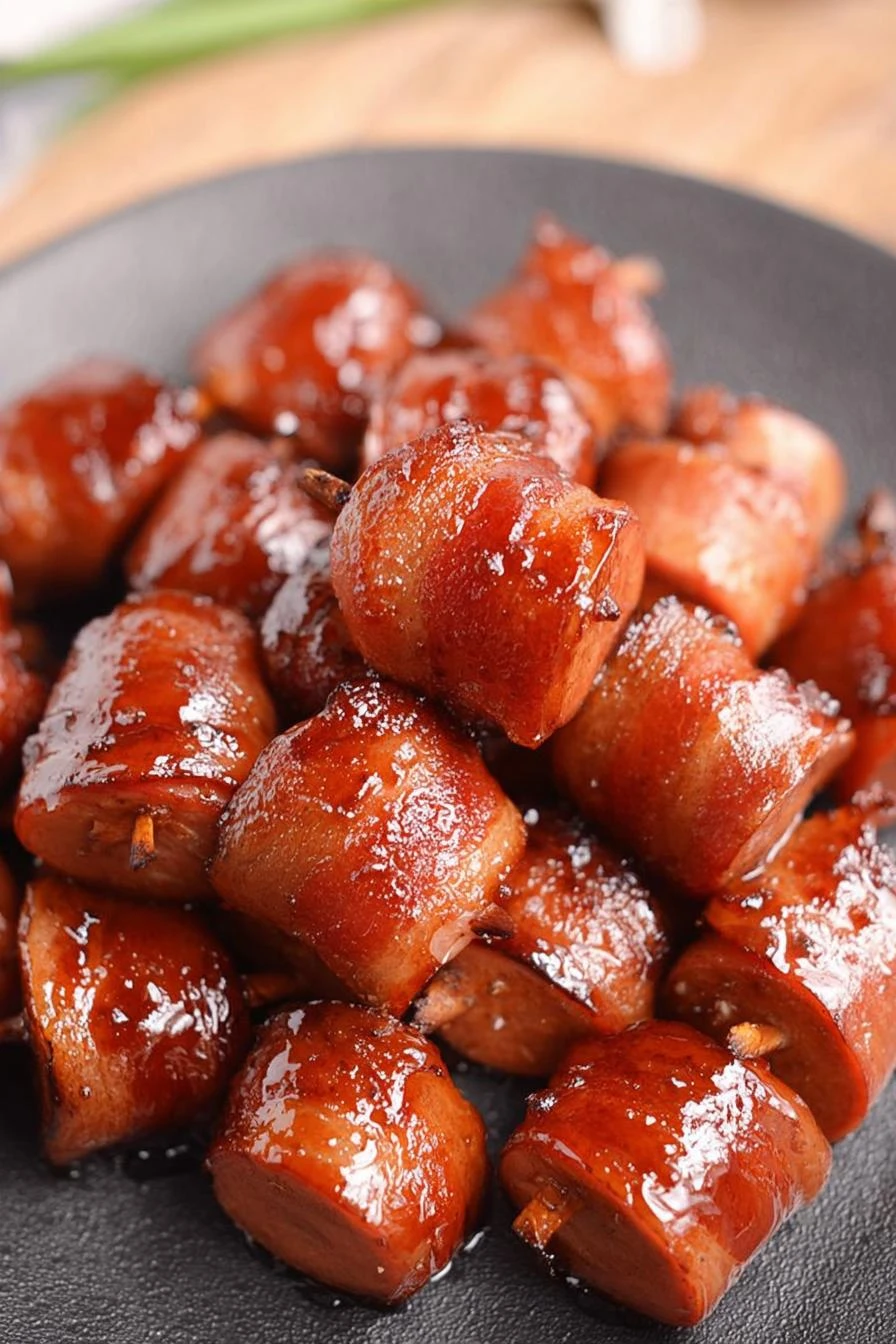 - Listen for bacon crackle and watch glaze become thick and glossy. Squeeze bites gently to confirm crispiness outside with soft sausage interior.