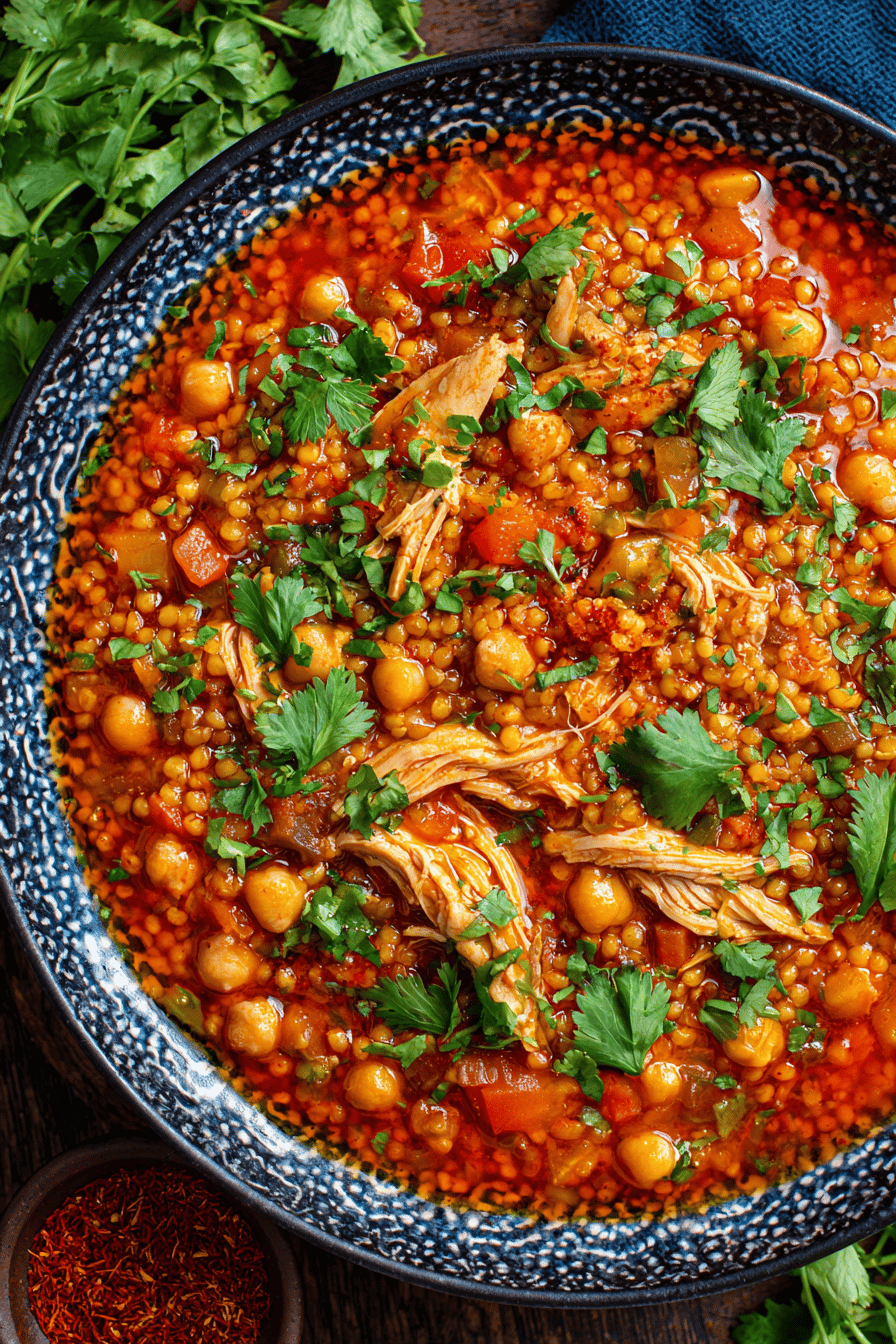 Refrigerate in airtight container up to 3 days. Reheat gently on stove to avoid drying chicken. Can freeze but texture changes in bulgur; better fresh. Add fresh coriander at serving for brightness.