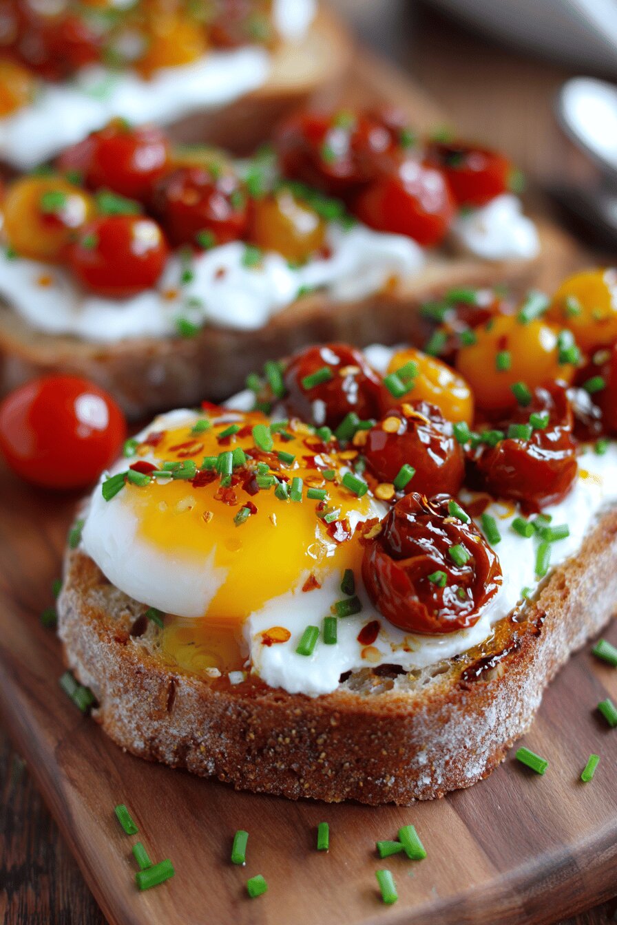 - 💡 Chives cut into 1.5 cm sticks give textural bite, not just flavor. Too fine and they disappear. Scatter fresh right before serving to maintain snap and brightness. Flaky salt sprinkled last adds crunch and sharp seasoning spots. Crushed chili flakes optional, add flickers of dry heat to balance creaminess and sweetness. Timing important - serve immediately to keep tomatoes warm and yolks runny.