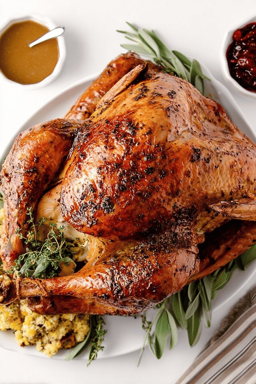 - After about 3 hours, reveal turkey by removing foil entirely. Give it a last heavy baste then return uncovered for 25 to 30 minutes more, watching skin turn deep golden brown with crispy edges while juices run clear. Thigh meat hits about 178-180°F internal temp when done but eyeball texture too; it should yield easily under thumb pressure, juices running clear near the leg joint.