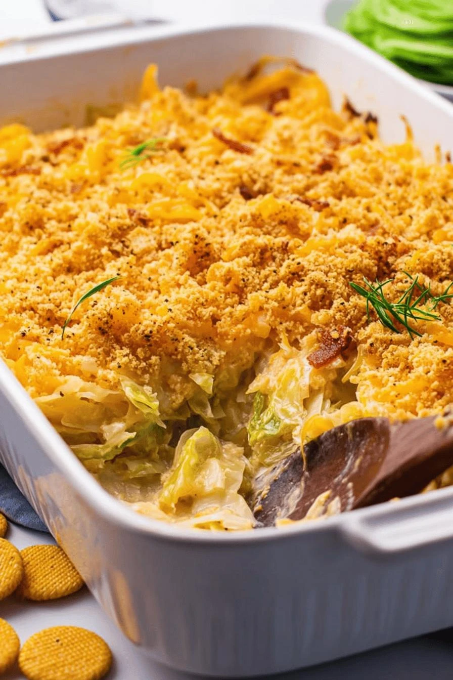 - 5 Combine remaining 1/4 cup melted butter, 1 cup shredded cheddar, and crumbled Ritz crackers in a small bowl. This topping crisps during baking. Scatter evenly over cabbage layer.