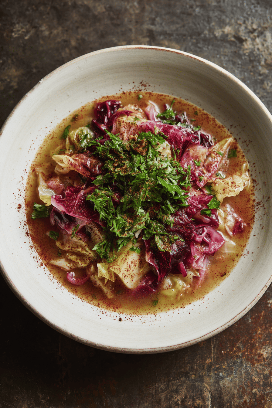 Starting with a hot pan full of onions sliced thin — hear the soft sizzle when they hit the oil. That smell, a bit sweet, a bit savory, signals the base of everything to come. Brown sugar over the onions? Yes, it’s old-school but necessary, a caramel crust building flavor no bland broth can match. Deglazed aggressively with white wine vinegar, the sharp bite wakes up the pot. Potatoes and earthy beets sliced just so, folding into the simmerhead of green cabbage layers. Timing? Don’t rush it, but don’t lose the snap. That cabbage translucency, that beet color seeping into the broth — the visual part of knowing you’re close. Parsley dropped at the end for a punch of green freshness, because no one wants a dull soup. Tried swapping chicken broth to vegetable years ago, gave the whole bowl a rustic depth I keep coming back to. Smoked paprika? Little secret I toss in when the nights start to turn colder.