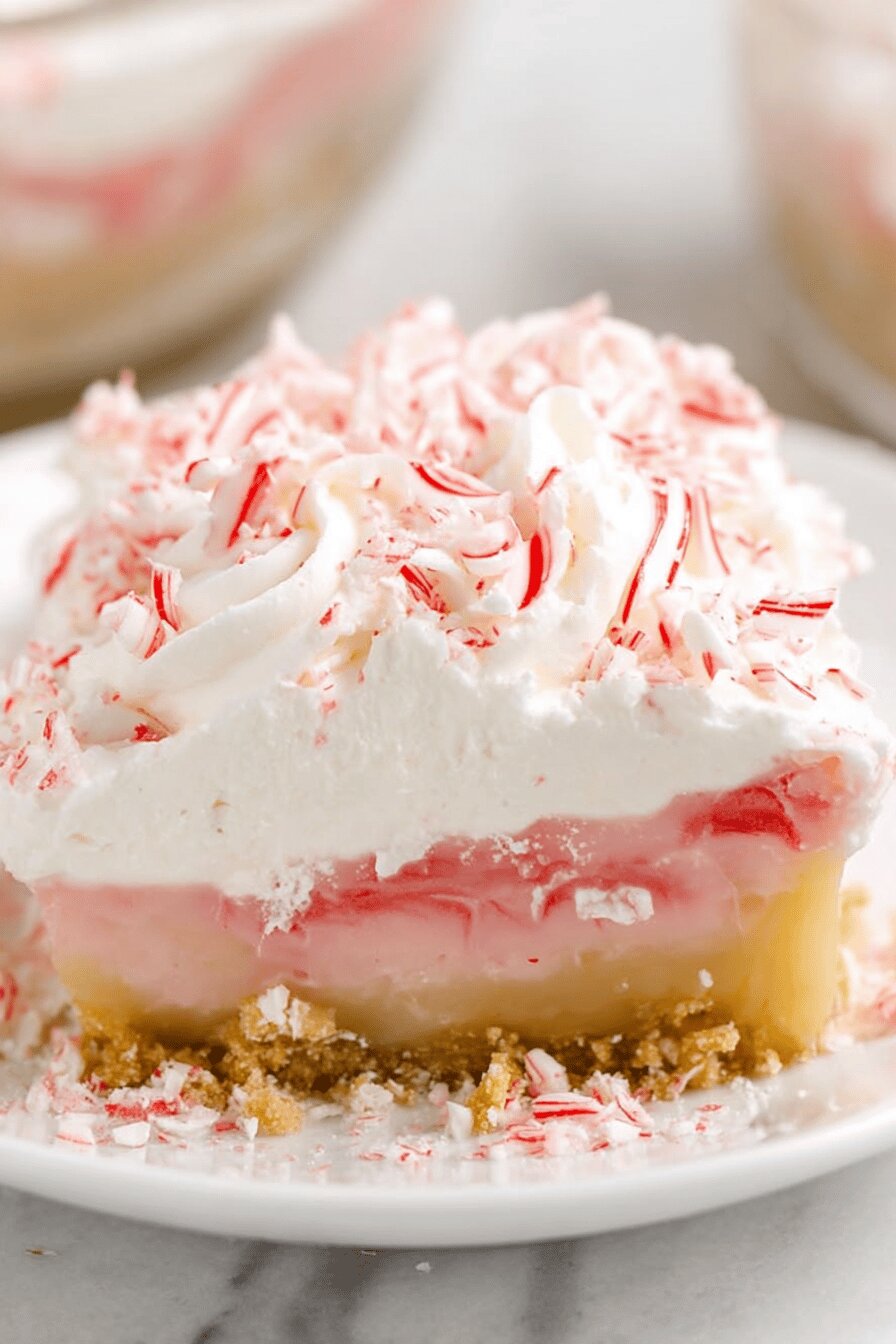 - 💡 Cool Whip topping should stay fluffy but thick. Applying too thin or too heavy makes layers collapse or slide. Sprinkle crushed candy cane chunks last, big pieces retain crunch; fine crumbs melt fast in fridge dulling texture. Use hot knife dipped in water wiped dry for clean cuts.