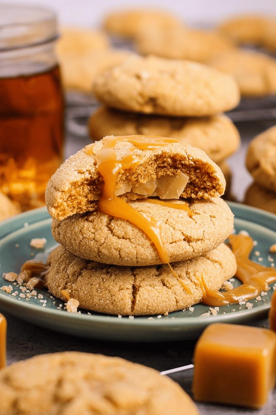 Cut caramel into halves or smaller pieces, roll dough balls tight, seal seams well. Use parchment lined sheets, space balls at least 2 inches apart to avoid spread. Overstuffing leads to oozing mess.