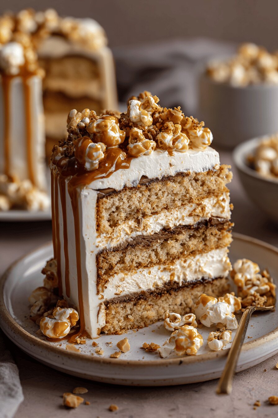 - 💡 Caramel sauce can vary; store-bought works but homemade richer, deeper burnt sugar scent. Drizzle carefully, half before popcorn, half after, to avoid soggy layers. Chill assembled cake 30 minutes minimum for setting; buttercream firms but stays creamy. Serve closer to room temp to soften buttercream and release aromas. Leftovers: air tight box at room temp for 2 days max, popcorn loses crispness fast, fudge hardens and stale flavors creep in. Refrigeration ruins popcorn crunch but preserves cake longer; prioritize fresh texture.