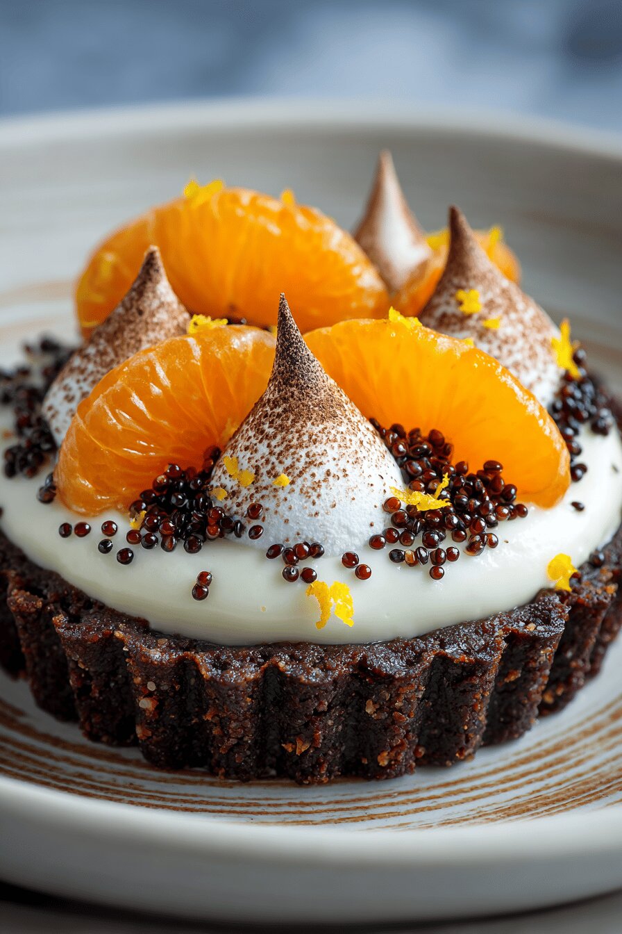 - 💡 Final assembly just before serving to keep textures crisp. Peel tangerines ‘à vif’, remove all white pith to avoid bitterness. Use zester to create thin lemon peel strips for aromatic contrast. Scatter meringues and quinoa around. Serve immediately. Meringues and quinoa can stale if pre-assembled. Tart best same day after chilling to hold set but not soggy.