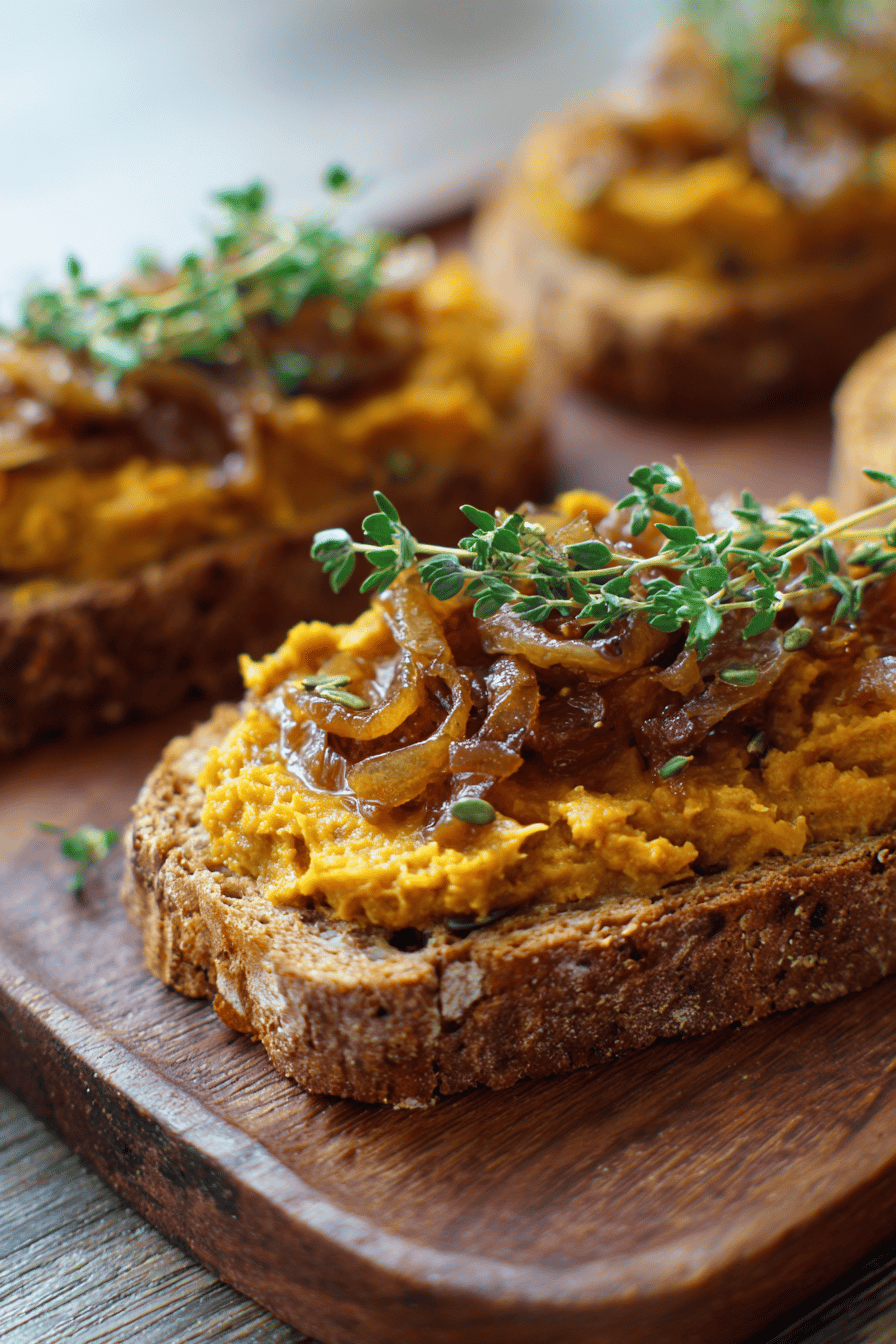 A vegan, gluten-free spread with caramelized onions, sweet potatoes, and sunflower seeds. Uses turmeric for warmth, nutritional yeast for umami, and subtle mustard for tang. Seeds add crunch. Baked to meld flavors. Chilled for firmer slicing. Keeps a week refrigerated. Ideal for sandwiches or crackers.