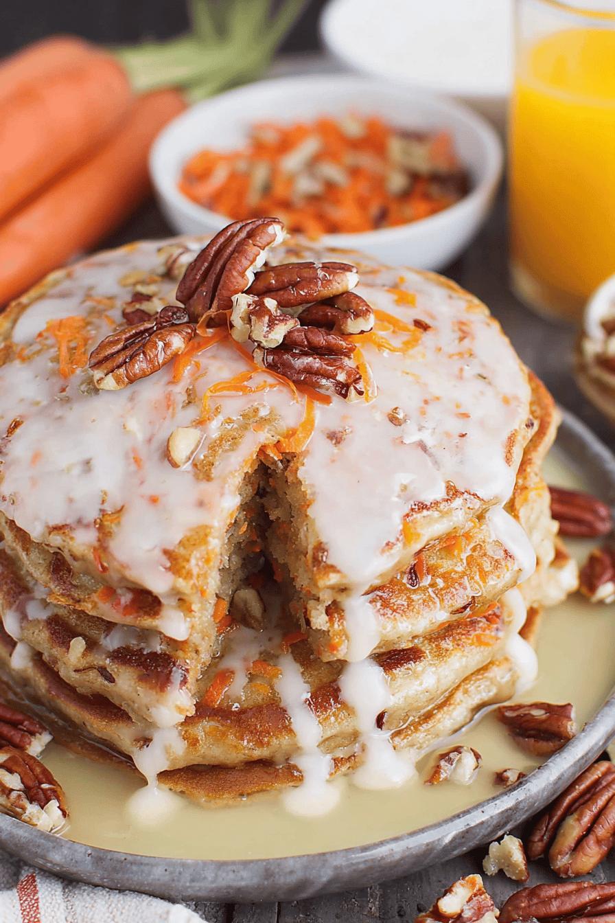 - Serve stacked, scatter chopped nuts if you want crunch contrast. Dollop butter on top. Slather cream cheese glaze generously or serve on the side. The glaze is tangy, sweet, creamy; a breakfast counterpoint to earthy carrot.