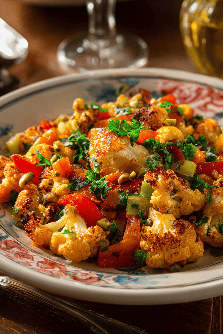 A vibrant veggie dish riffing on cauliflower couscous, swapping celery and apricots for bell pepper and golden raisins. Ground cumin and smoked paprika spark a warm aroma. Green apple diced joins tartness; toasted pistachios bring crunch. Simmered gently until cauliflower’s tender but still with bite. Bright lemon juice and fresh parsley finish. Easy, gluten-free, dairy-free, and egg-free. Adaptable. A pantry-friendly veggie-forward side or light main. Visual cues and bite texture guide doneness, no watch-clocking. Simple swaps for allergy or availability. Rustic, layered textures and fragrant spices invite. Makes 4-6 servings, quick to put together. Sound of sizzling butter and spices, smell of fruit sweetness mingle. Cauliflower’s subtle earthiness rounds it off.