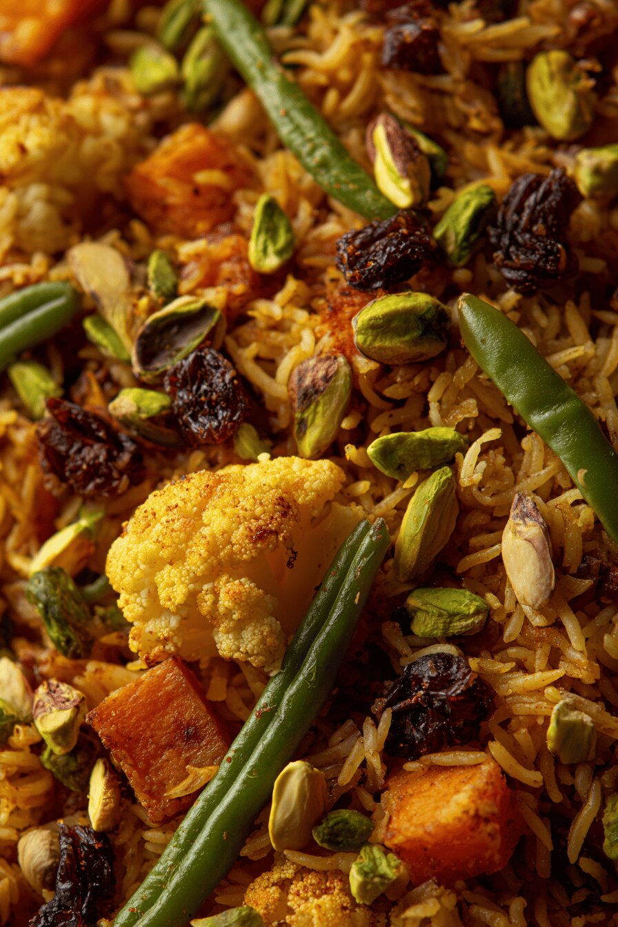 Long grain rice and veggies simmered with warming spices, nuts, and dried fruit. A quick version, under an hour, no dairy or gluten. Onions caramelized, then ginger and curry powder hit the pan. Cauliflower florets and diced sweet potato replace traditional veggies. Swaps peas for green beans. Pistachios and golden raisins add crunch and sweetness. The pot simmers gently until grains absorb flavorful broth. Resting time allows the last steam to fluff the rice. Every bite a mix of textures and subtle heat, simple ingredients, elevated.
