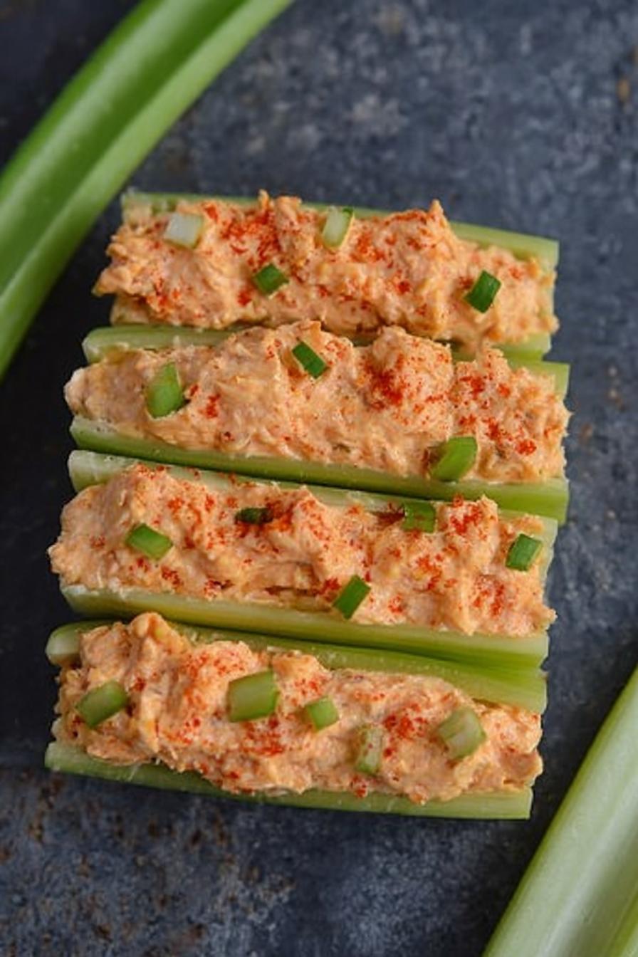 - Spoon softened pimento cheese over celery grooves. Not too much or it slides off. Use back of spoon to compact gently.