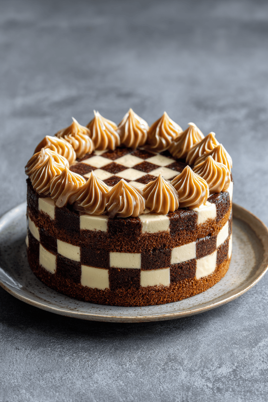 - 💡 Cut layered rounds vertically into 3 strips for checkerboard slices. Press gently after stacking layers with caramel glue to fuse sides. Spread buttercream over cake thin and even; chill slightly before dusting cocoa. Frosting air whipped for light texture but hold shape. Cocoa powder dusting optional for rustic look, enhances visual depth.