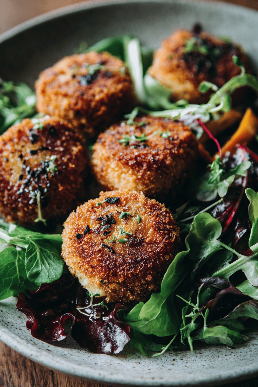 Cheese croquettes reimagined. Ricotta for softness. Smoked mozzarella adds a savory twist. Walnuts give texture, crunch. Thyme instead of basil, cumin to bump spice slightly. Breadcrumbs slightly up, cheese cottage down, changing mouthfeel. Baking, then broiling for crisp crust. Quick prep, about half an hour total. Four croquettes, big enough for a light meal. Not just a snack anymore. Serve alongside fresh leafy greens or grilled veg. Great for vegetarians, filling, simple ingredients. No frying necessary.