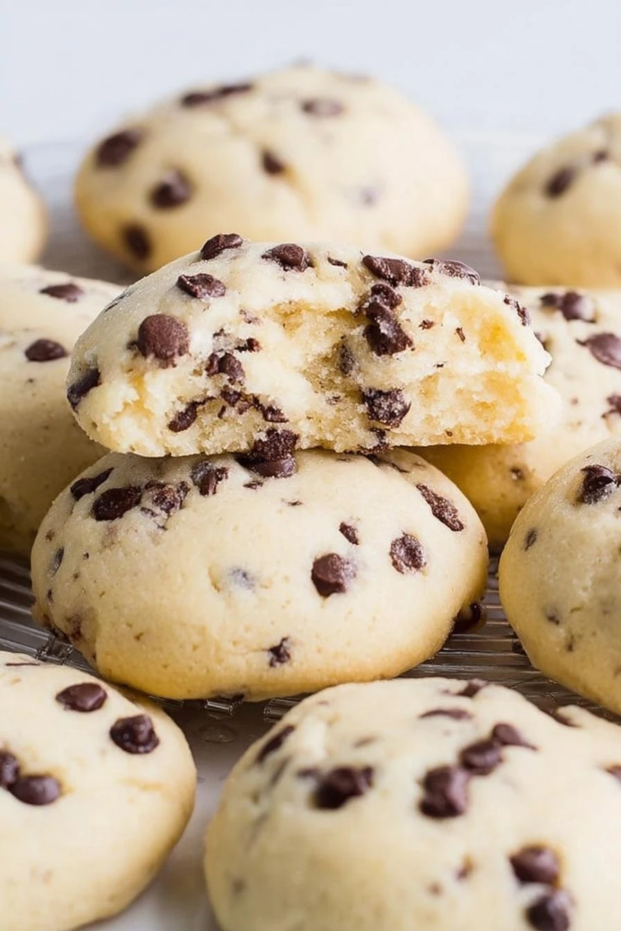 Flour. All-purpose. Two and an eighth cups. Sounds precise. It is. Get it wrong and the dough acts weird. Baking soda, baking powder, cornstarch. Half teaspoon each of the first two. A quarter teaspoon of the last. They work together — soda gives you spread, powder gives you lift, cornstarch makes it tender. Skip one and it’s not the same cookie. Cream cheese. Eight ounces. Softened. Don’t use cold cream cheese. It won’t mix right. Pull it out an hour before and let it sit on the counter. Granulated sugar and powdered sugar. Half cup of the first, a third cup of the second. The mix matters. Granulated helps with spread and structure. Powdered makes it tender and fluffy. Eggs. Two large ones. Room temperature works better than cold. Vanilla extract — a teaspoon. Heavy cream — three tablespoons. Mini semisweet chocolate chips. Half a cup in the dough, plus more for the tops.