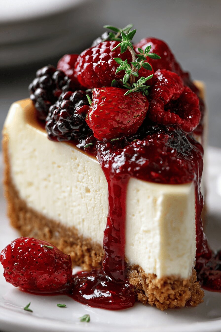 Crust swaps classic oats for graham crackers — crunchier, less dense. Brown sugar softens margarine fats for binding. Part cream cheese tempered with ricotta, lighter texture. Cornstarch steadies filling without flour’s heaviness. Greek yogurt adds slight tang replacing sour cream’s creaminess. Vanilla extract for aroma. Berries frozen mixed: strawberries, raspberries, blueberries — puréed then strained to smooth sauce. Sugar adjusted by taste; berry sweetness varies.