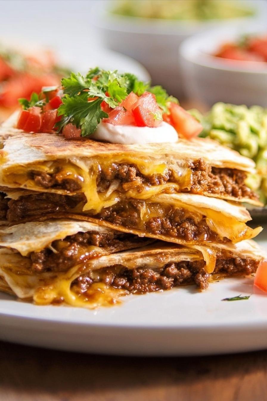 Don’t crowd your skillet with beef, or it steams instead of browns. When browning, listen for that faint crackle and watch edges darken—not just for color but Maillard reaction developing flavor layers. After adding tomato sauce and spices, lower heat slightly; you want reduction, not burning or sticking. Butter in skillet should foam gently, if it browns fast pull heat back immediately. Layering cheese both below and above beef acts like glue—prevents filling from slipping out during flips. Use a thin metal spatula to flip; slow and steady, keep edges aligned. Resting quesadilla off heat lets molten cheese solidify just enough so it cuts clean instead of oozing everywhere. Rinse pan between quesadillas if bits burn and start smoking; a burnt taste ruins the fresh flavors.