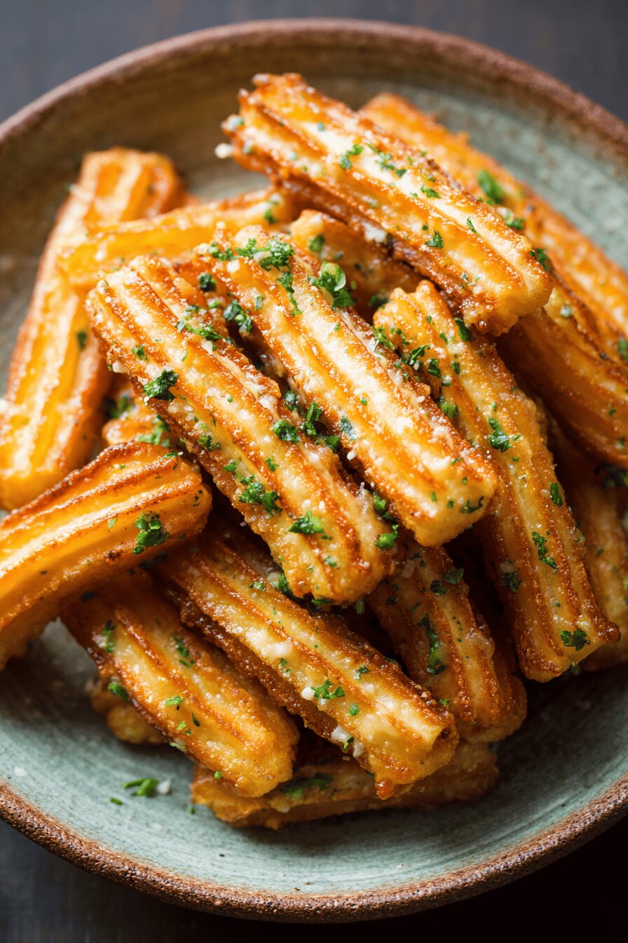 Churros fried crisp, with a cheesy, herbaceous twist; Parmesan swapped for Pecorino, Gruyère swapped for aged cheddar. Heat tamed down for precise texture. Garlic powder added to garnish mix. Dough cooked until peel-away from pan, eggs added to lighten and bind. Fry done until golden brown, flaky crust formed. Garnish sharp, with a bite of cayenne. Usually, minor burn risk on too-hot oil. Timing shifted slightly. Piping handled over fryer carefully or messy splatters happen. Notes on substitutions and troubleshooting included.