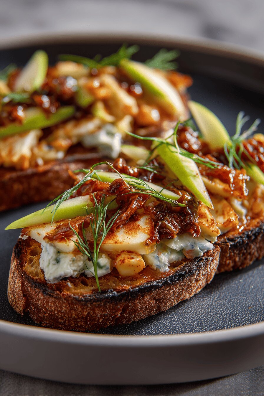 A riff on the classic Welsh Rarebit swapping cheddar for aged gruyère and crème fraîche for crème légère for a lighter touch. Toasted sourdough base gets smeared with caramelized shallot jam, then piled with a tangy cheese mix enriched with Dijon and a hint of smoky paprika. Quick broil melts the cheese bubbling hot, browned edges whispering ‘come eat me.’ Served with a crisp bite of pickled fresno chiles plus tart green apple slices tossed in lemon juice. Bold flavors, creamy texture, sharp tang, and crunchy finish. No salt needed, the cheese pulls enough. Simple but layered. Timing flexible by watch and slide of spatula under melty cheese. Adds a warm smoke aroma you won’t forget. Great for late lunch, snack, or easy supper.