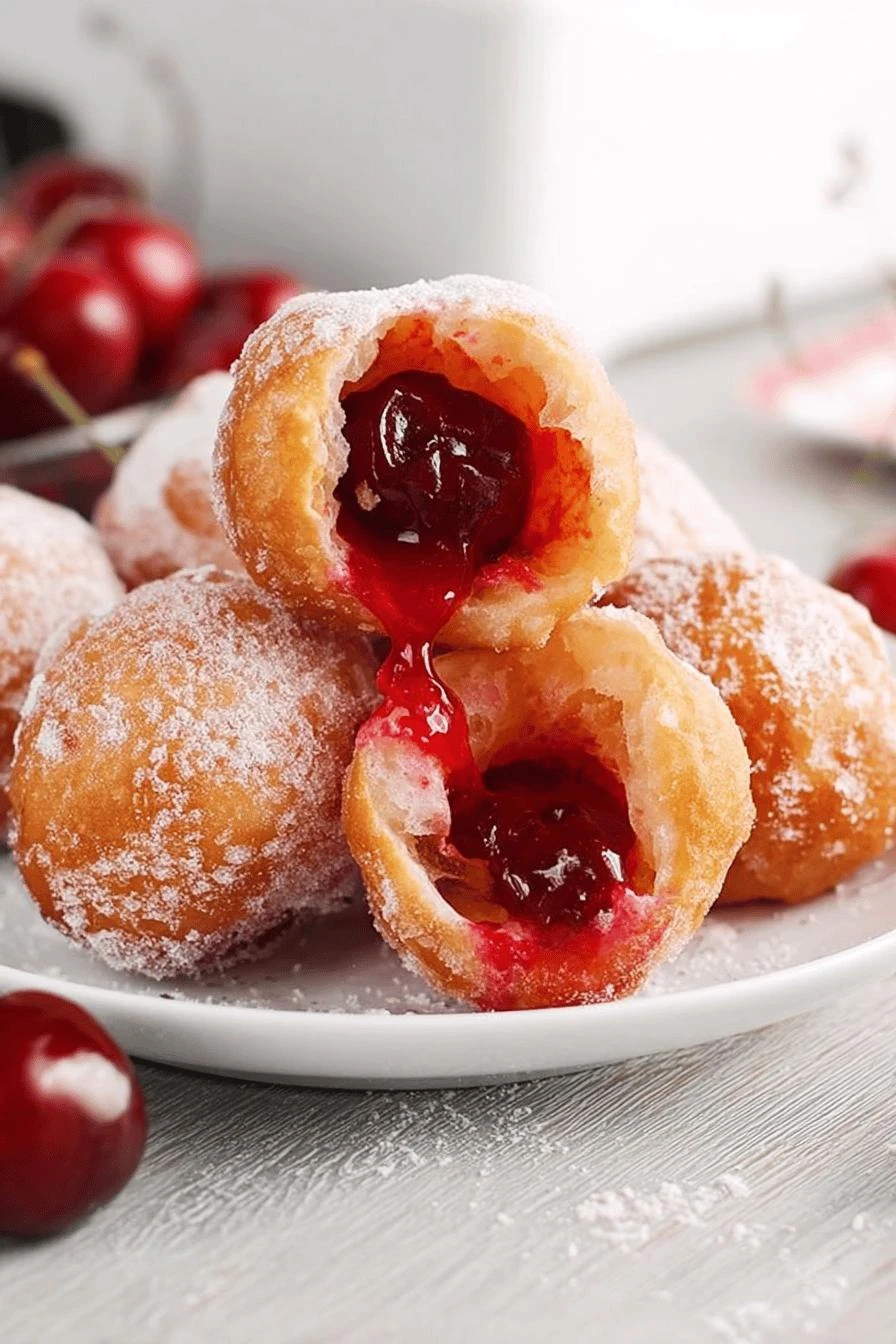 Bite-sized cherry filled dough balls fried golden then glazed sweet. Uses biscuit dough torn and slightly pressed, filled with cherry pie filling. Deep-fried at steady 320-330°F range till puffed, golden brown all around. Coated in sugar glaze with powdered sugar, milk and corn syrup for shine. Watch oil temp, pinch edges well; avoid thin dough or bursting. Quick fry, about 4-6 minutes, turning often. Crisp outside, juicy inside. Serves 16. Alternative cherry jam or mixed berry preserves for twist. Calories around 210 per bite. Fat low — moderate sugar load. Sodium moderate. A practical snack; watch for sticky dough traps and monitor temp to skip greasy results. Simple, nostalgic, easy to customize.