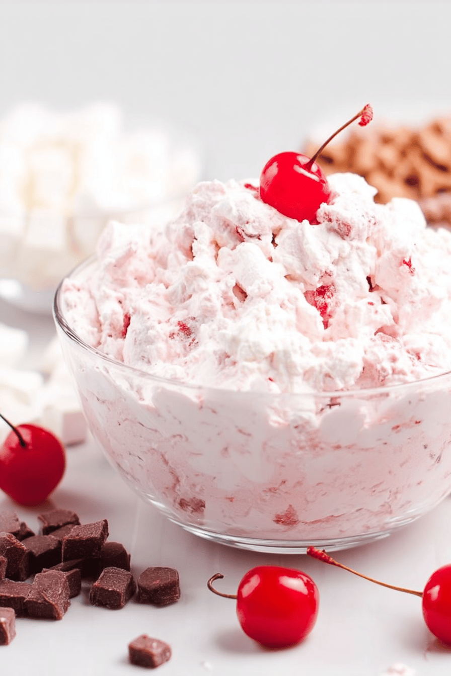 - 💡 Mini marshmallows add chew, nuts add crunch—together keep texture alive. Add marshmallows in batches, not all at once, especially if fluff feels wet. More marshmallows or nuts can fix runny texture before chilling. Folding technique impacts fluffiness: scoop under, slow turns, don’t stir hard. Refrigerate wrapped tight, avoid fridge smells seeping in. Timing varies; fluff thickens gradually. Stop chilling before marshmallows turn mushy or liquid seeps out. Before serving, scatter mini marshmallows and cherries dry for brightness plus bite contrast.